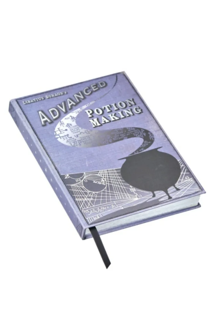 Lined journal with a replica of "Advanced Potion Making" textbook cover designed by MinaLima for the Harry Potter™ films. The beautifully detailed cover is printed on thick cardboard with silver foil edging around the pages and includes a sewn-in black ribbon bookmark.