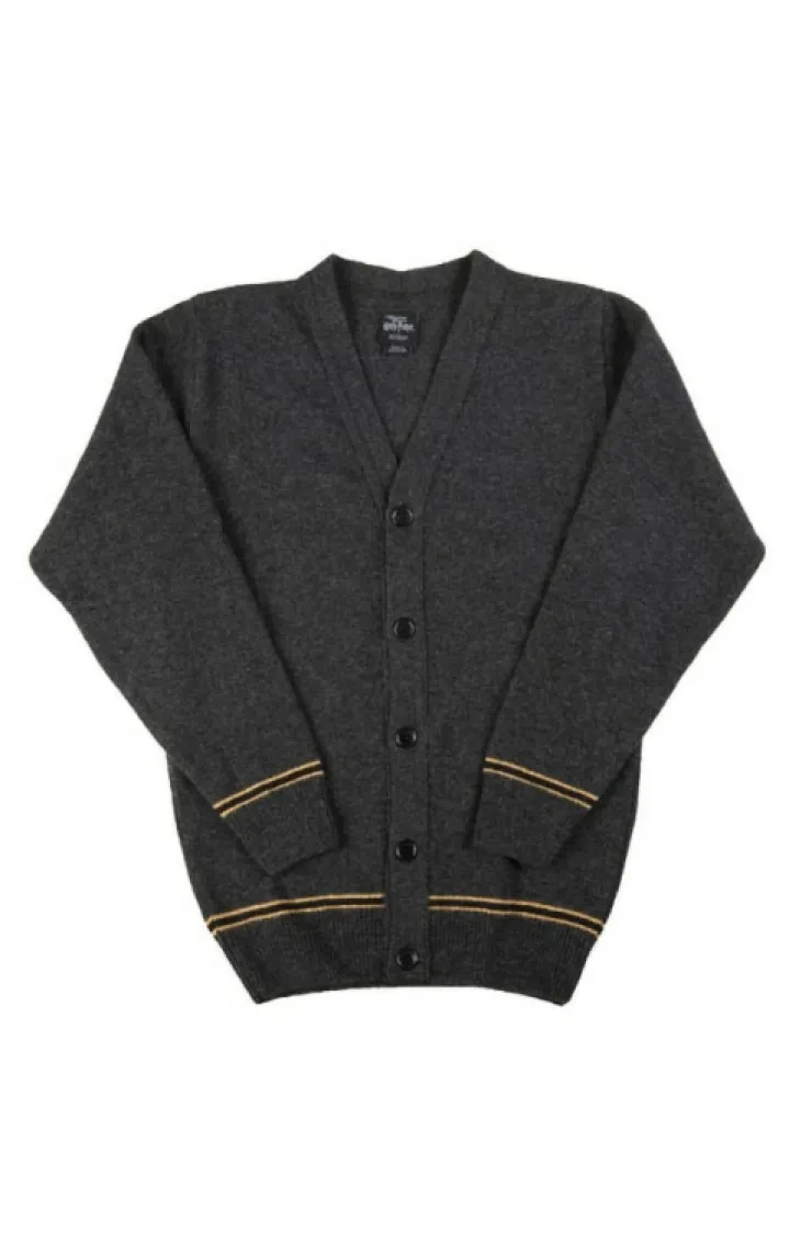 This charcoal V-neck cardigan, featuring crew cuffed wrists and bottom, is an authentic Hufflepuff™ sweater like those seen in the films. Created in fine gauge from natural lambswool, the sweater sports house colors in dual yellow pin stripes flanking a black center stripe woven into the base of the body and sleeves. The hemmed closure with five black buttons and stitch-finished button holes lay flat.