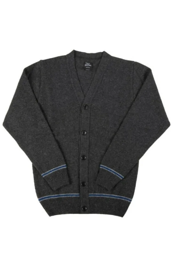 This charcoal V-neck cardigan, featuring crew cuffed wrists and bottom, is an authentic Ravenclaw™ sweater like those seen in the films. Created in fine gauge from natural lambswool, the sweater sports house colors in dual grey pin stripes flanking a blue center stripe woven into the base of the body and sleeves. The hemmed closure with five black buttons and stitch-finished button holes lay flat.