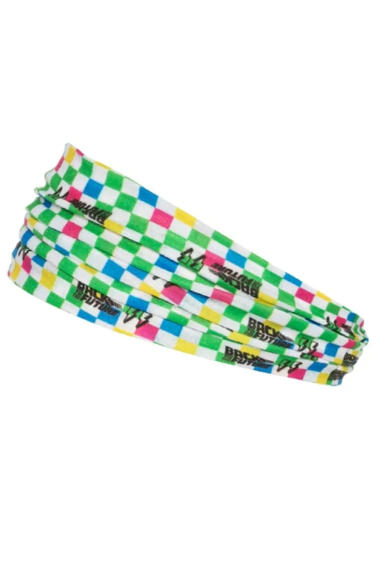 Back to the Future headband featuring the Back to the Future logo and lightning bolts on a colorful retro checkered background.