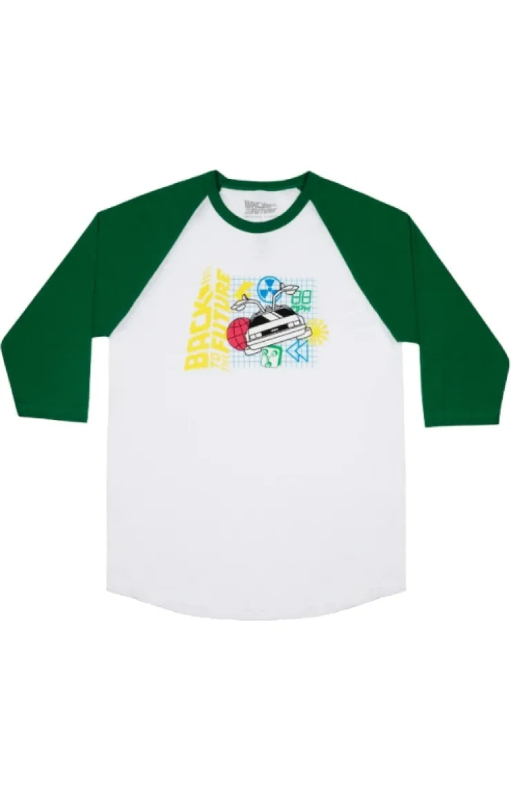 Back to the Future raglan shirt in the color white with green sleeves featuring the time machine surrounded by colorful symbols from the film and the Back to the Future logo on the side.