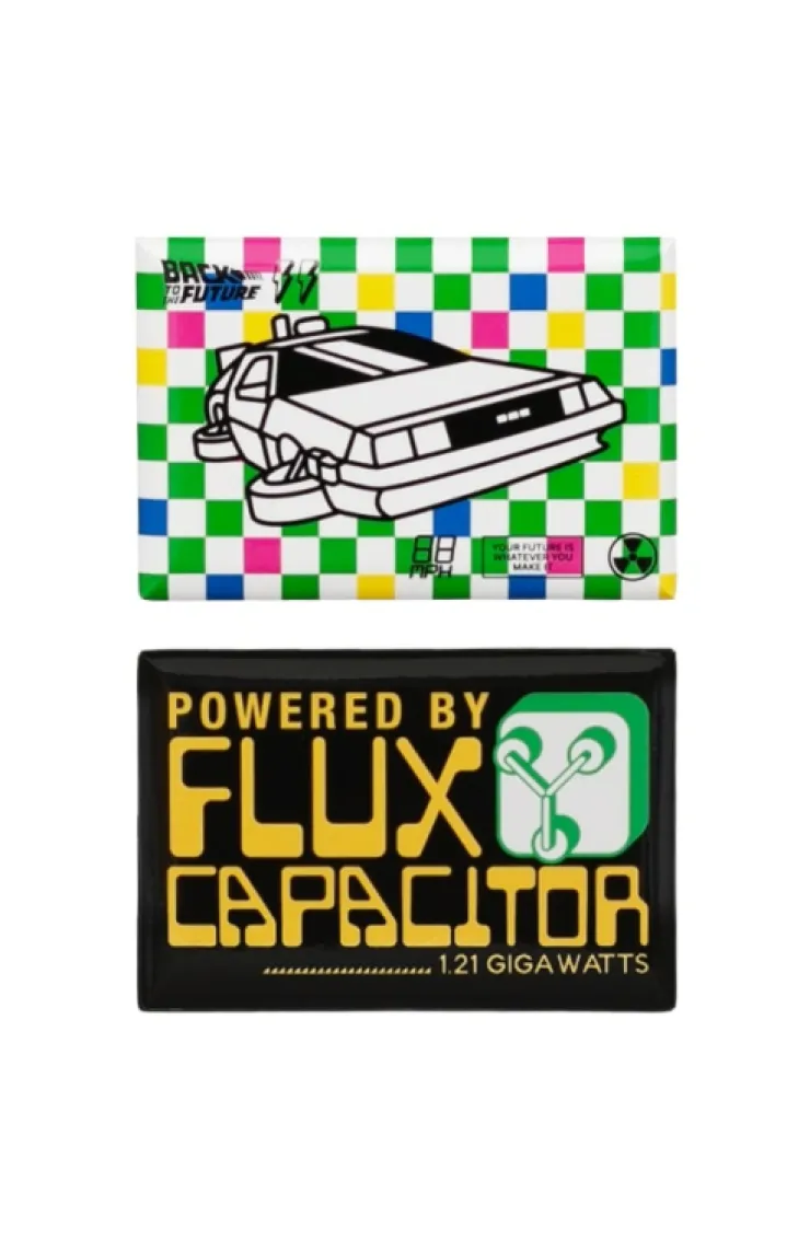 Back to the Future magnet set, one magnet features the time machine on a colorful retro checkered background. The second magnet features "Powered by Flux Capacitor" on a black background.