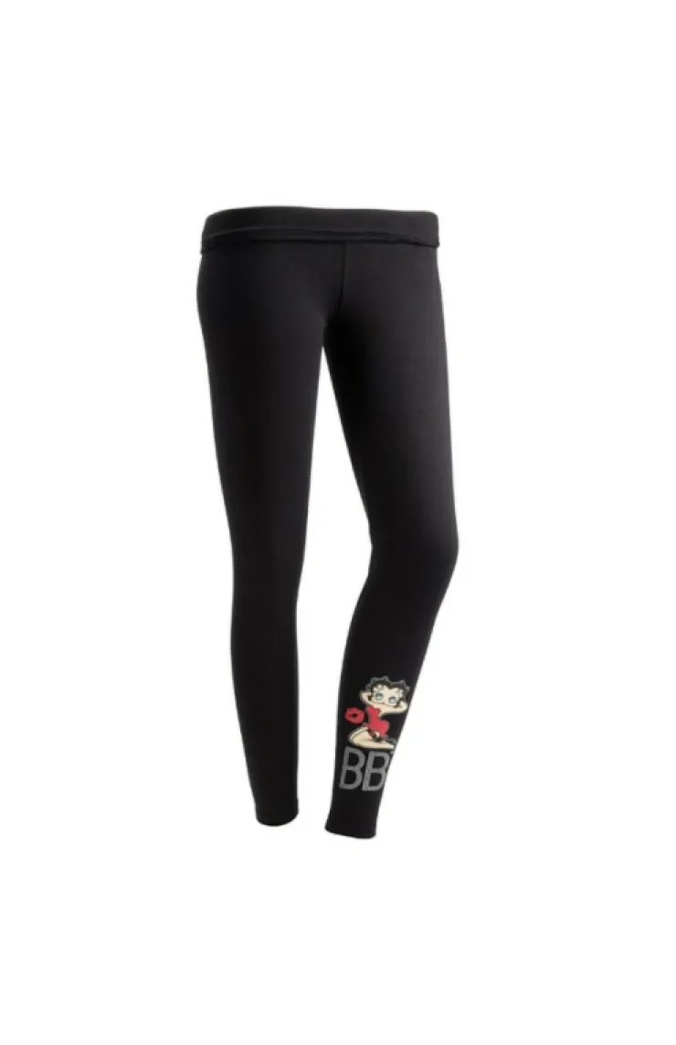Be cute and comfortable in these solid-black, ankle length leggings with a touch of sass. Iconic Betty Boop poses in her signature red dress over rhinestone initials with shimmering detail on the bottom left leg.