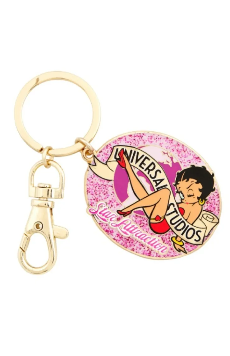 Betty Boop is the "Star Attraction" with a gold-tone banner that reads Universal Studios™ wrapped around her in an iconic pose. Keychain features a beautiful pink background that is accented by fuchsia glitter with a tonal pink globe, and also includes a lobster claw clip for easy attachment to keep your keys close by.
