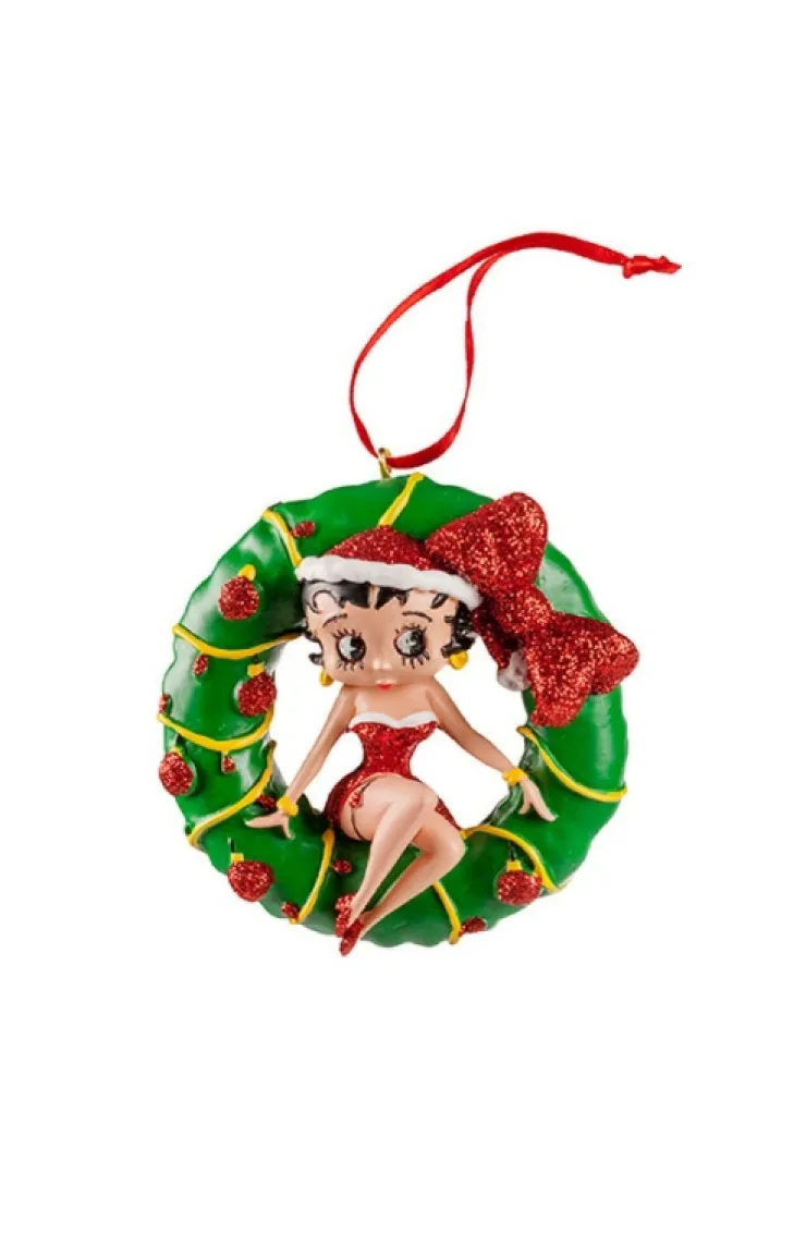 Swinging on a holiday wreath, Betty Boop is dressed up as the sweetest Santa ever with this glittery ornament in resin.