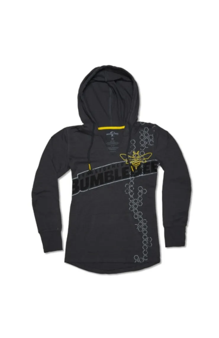 This lightweight, hooded ladies pullover features a distressed screen print "Bumblebee" lettering and detail, accented with a yellow embroidered bee on a dark gray garment. A hand warmer pocket and ribbed cuffs with yellow neck tape and drawstring wraps complete the look.