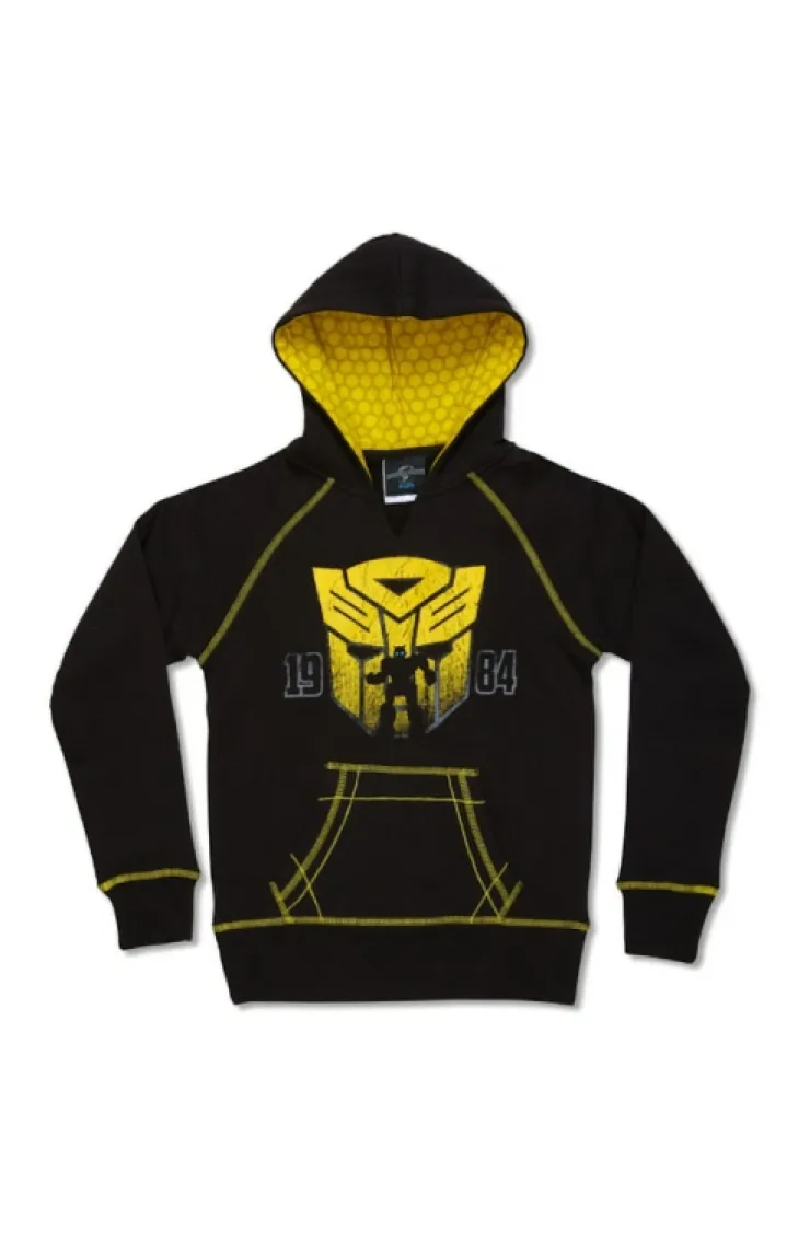 Stylish design accents add to the cool vibe of this solid black pullover hoodie featuring a stylized image of Bumblebee against an Autobot shield background. Yellow adds the perfect color accent in the honeycomb printed hood lining, the distressed printed Autobot shield, and in the stitching around the seams and hand warmer pocket.
