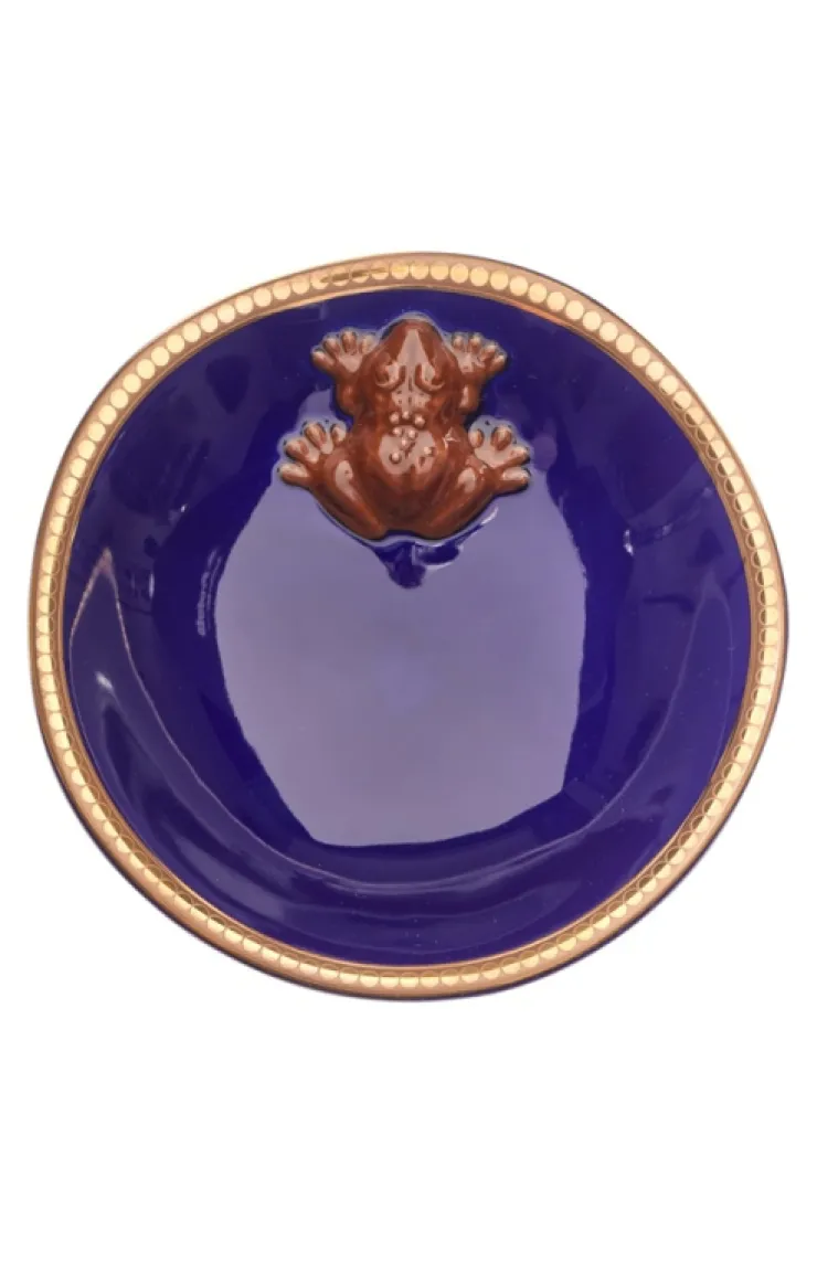 Elegant ceramic dish featuring a molded Chocolate Frog on the interior. On the exterior "Chocolate Frog" is printed in gold to accent the gold trim of the rim. In order to ensure the stability of the design, the plate is handwash only and not microwave safe.