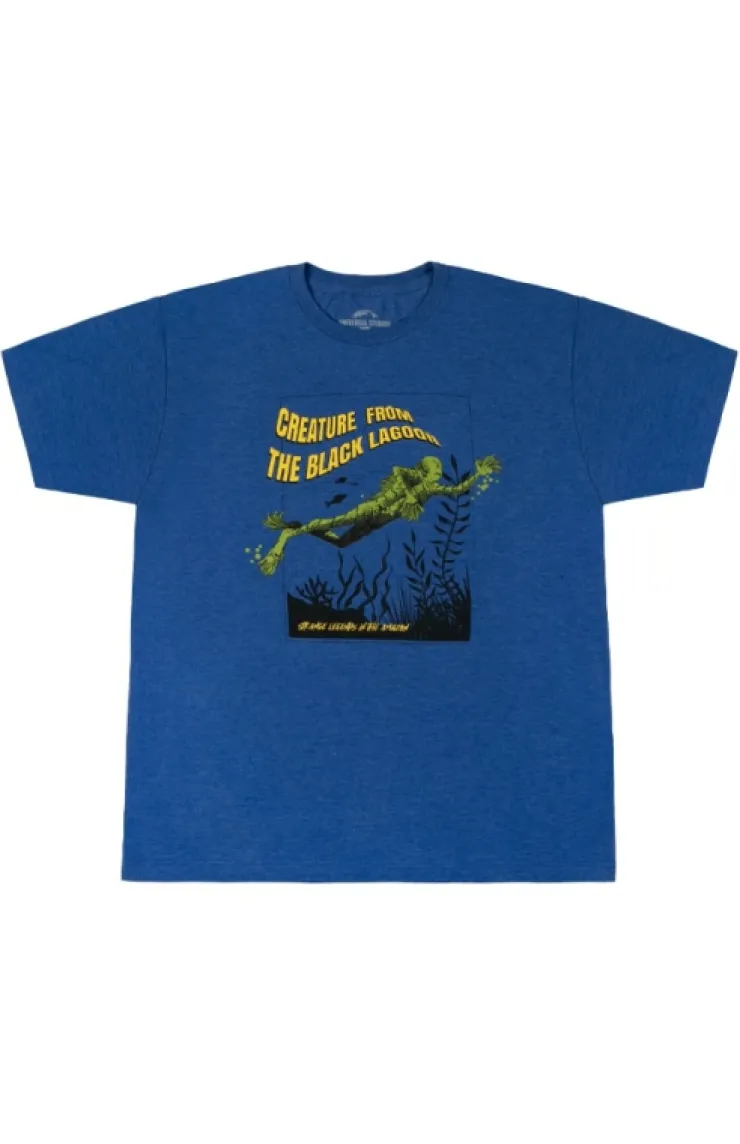 Creature from the Black Lagoon 70th Anniversary adult t-shirt in the color blue featuring the Creature swimming with "Creature from the Black Lagoon" across the top and "Strange Legends in the Amazon" across the bottom.