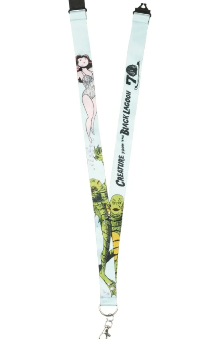 Creature from the Black Lagoon 70th Anniversary lanyard featuring different iconic moments from the film in a colorful cartoon design.