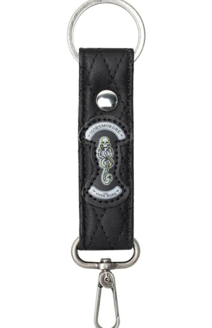 Faux-leather keychain with button closure strap featuring the Dark Mark. Keychain features spinning lobster claw and the button contains the spell "Morsmordre".