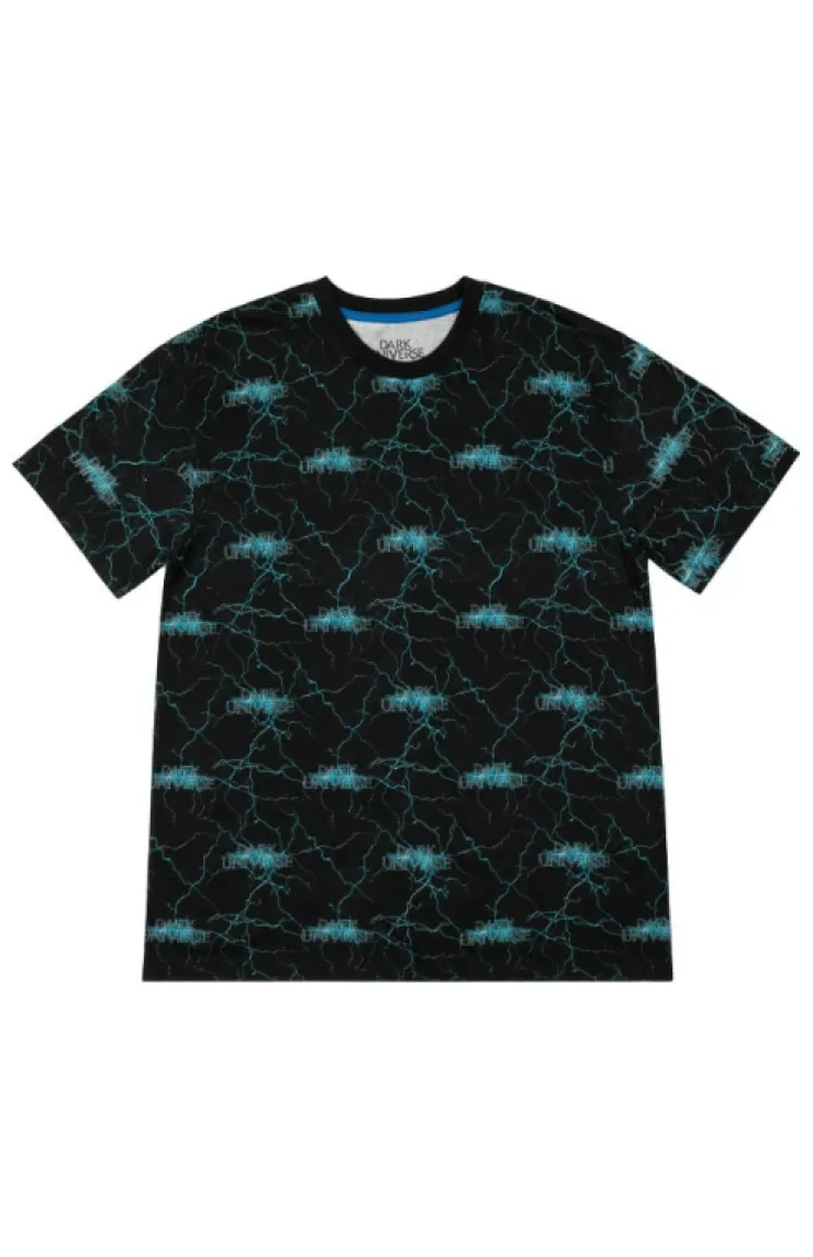Dark Universe adult t-shirt in the color black featuring an allover pattern of blue lightning strikes with the Dark Univ…