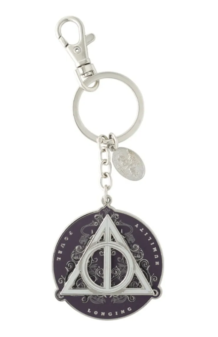 Deathly Hallows keychain from The Wizarding World of Harry Potter™. Features filigree design on an ornate circular dark purple background and word details "Power", "Longing" and "Humility" featuring the spinning icon on the front.
