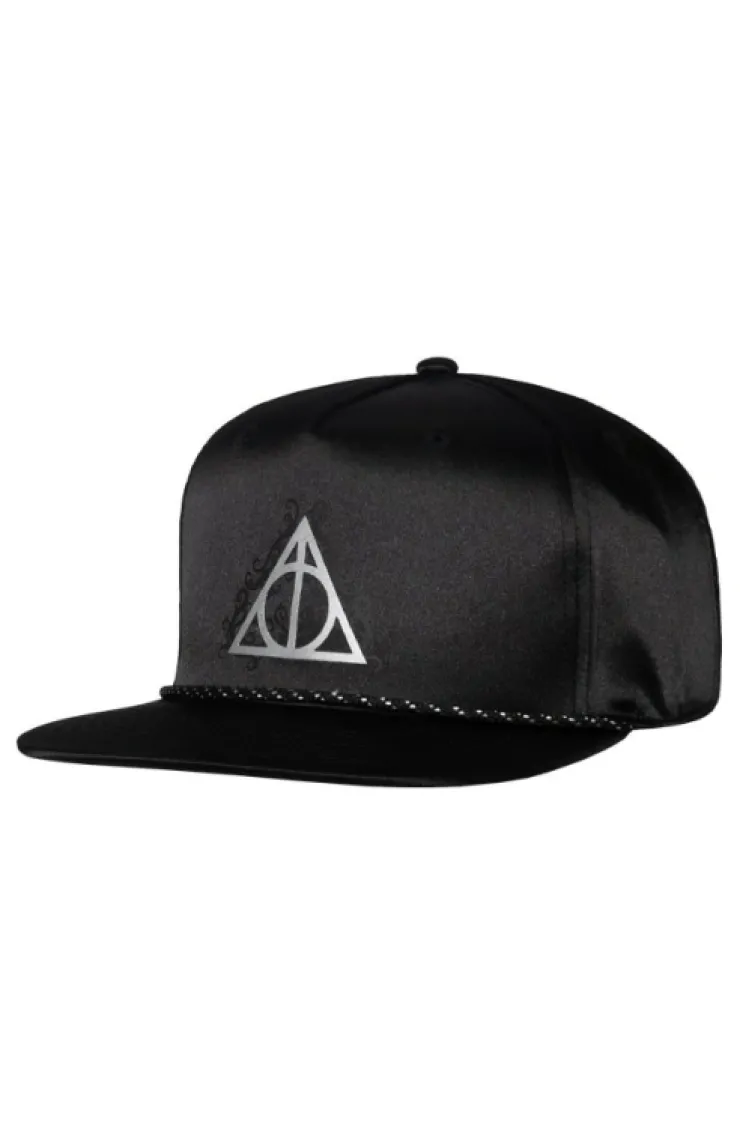 Solid black satin cap from The Wizarding World Of Harry Potter™ featuring the Deathly Hallows symbol with silver detailing.