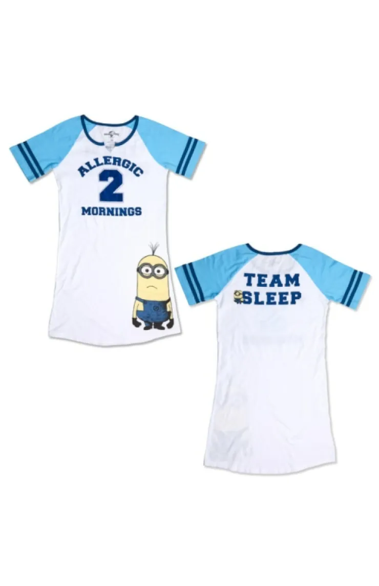 Don’t do mornings? You’ll relate when you slip into this jersey style adult nightshirt that lets everyone know that you are Allergic 2 Mornings. The number 2 has a flocked finish with an embroidered border, while the lettering and Minions are screen printed. The back reads Team Sleep and features a smaller Minion who’s ready to tuck in and say good night.