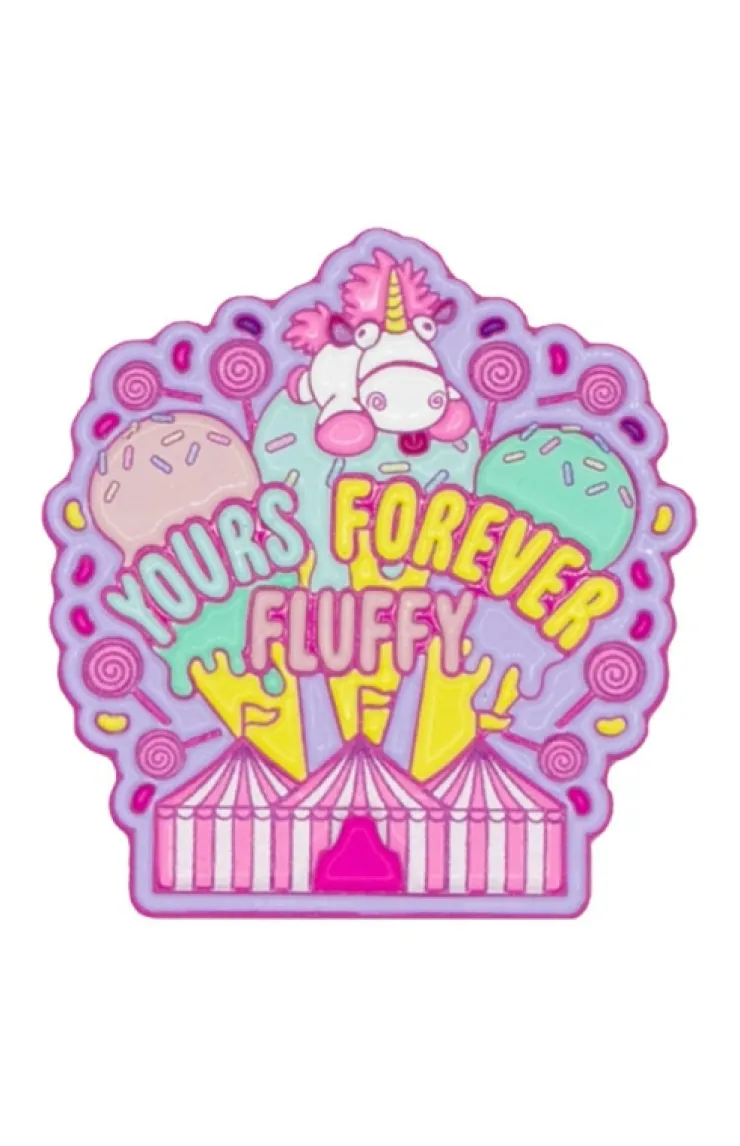 This "Yours Forever Fluffy" magnet features Fluffy Unicorn surrounded by delicious treats in a fun carnival setting. Design contains a pink toned metal with hard enamel fill.