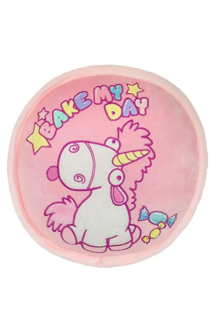 Despicable Me pillow featuring Fluffy Unicorn and "Bake My Day" written on the front. Macaron shaped pillow is covered in soft, pink and yellow faux fur with embroidered detailing throughout this adorable design.