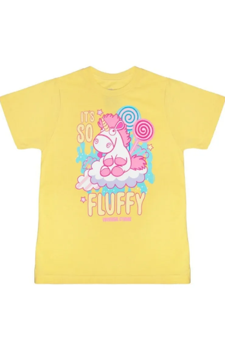 Colorful and cute youth t-shirt featuring Fluffy Unicorn with various sweet treats and "IT’S SO FLUFFY" written in bold, glittery lettering. Design is screen printed on soft, yellow colored shirt.