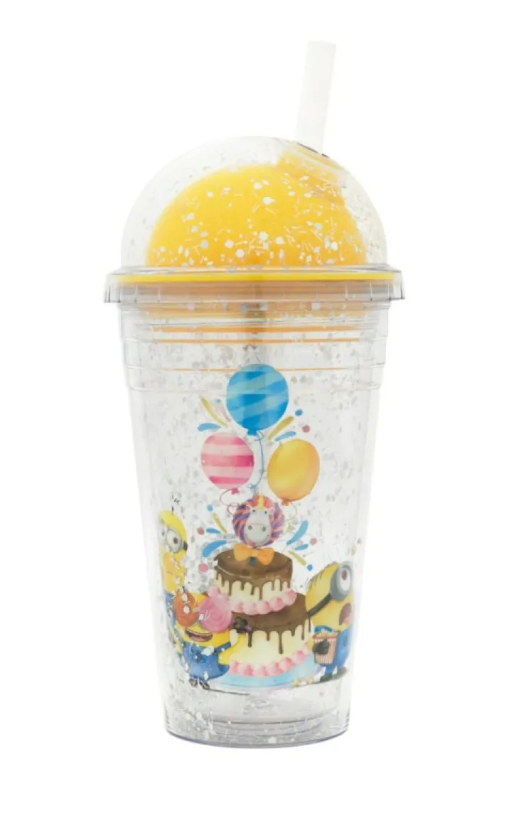 Take your favorite beverage with you in style with this acrylic tumbler featuring Kevin, Stuart, and Bob indulging in their favorite treats. Travel tumbler is double walled with holographic glitter between and has a tight-fitting domed screw top lid and removable straw.