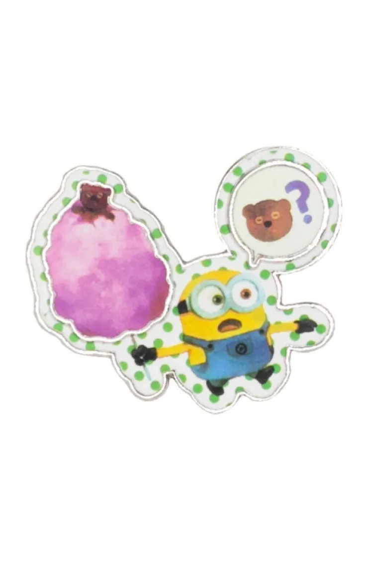 Fun Minion pin of Bob searching for Tim who is featured on his mind and in the cotton candy he is holding. Design is a silver toned metal with printed images and tack pin back.