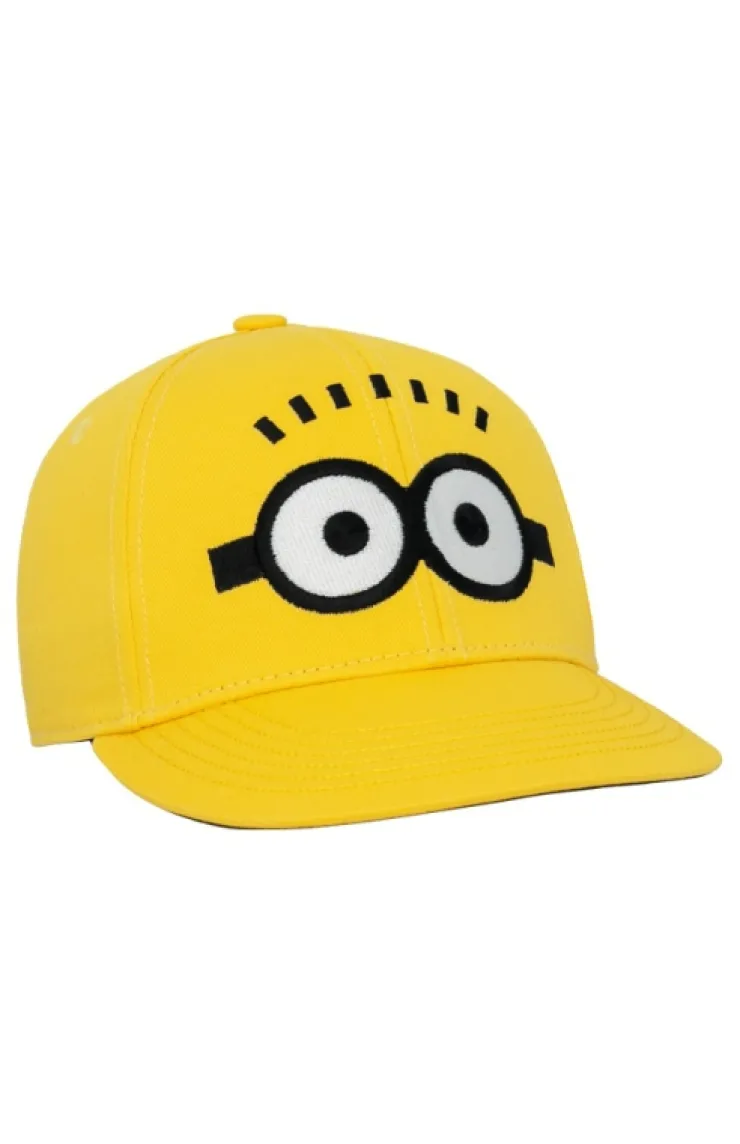 Despicable Me youth cap in the color yellow featuring a two-eyed Minion on the front and "Bello" on the underside of the bill.