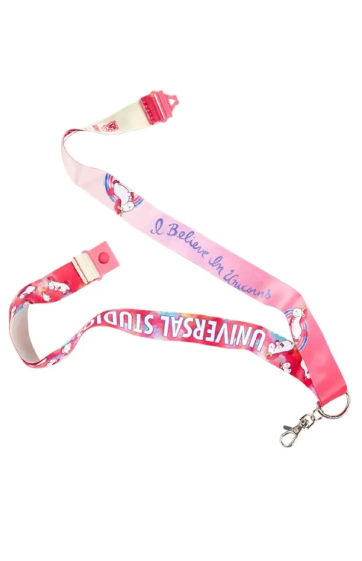 Do you believe in unicorns? This adorable, smooth-textured lanyard with breakaway closure is patterned with unicorns, with "I Believe In Unicorns" on one side and "Universal Studios" on the other. *Re-sealable lanyard pouch sold separately.