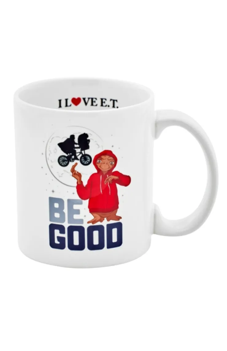 Proudly display E.T.'s message of "Be Good" with this mug. Double-sided design features E.T. in his red hooded sweatshirt, accompanied by the iconic image of E.T. riding past the moon in Elliot's bike basket. "I ❤ E.T." is printed on the inside lip of the mug.