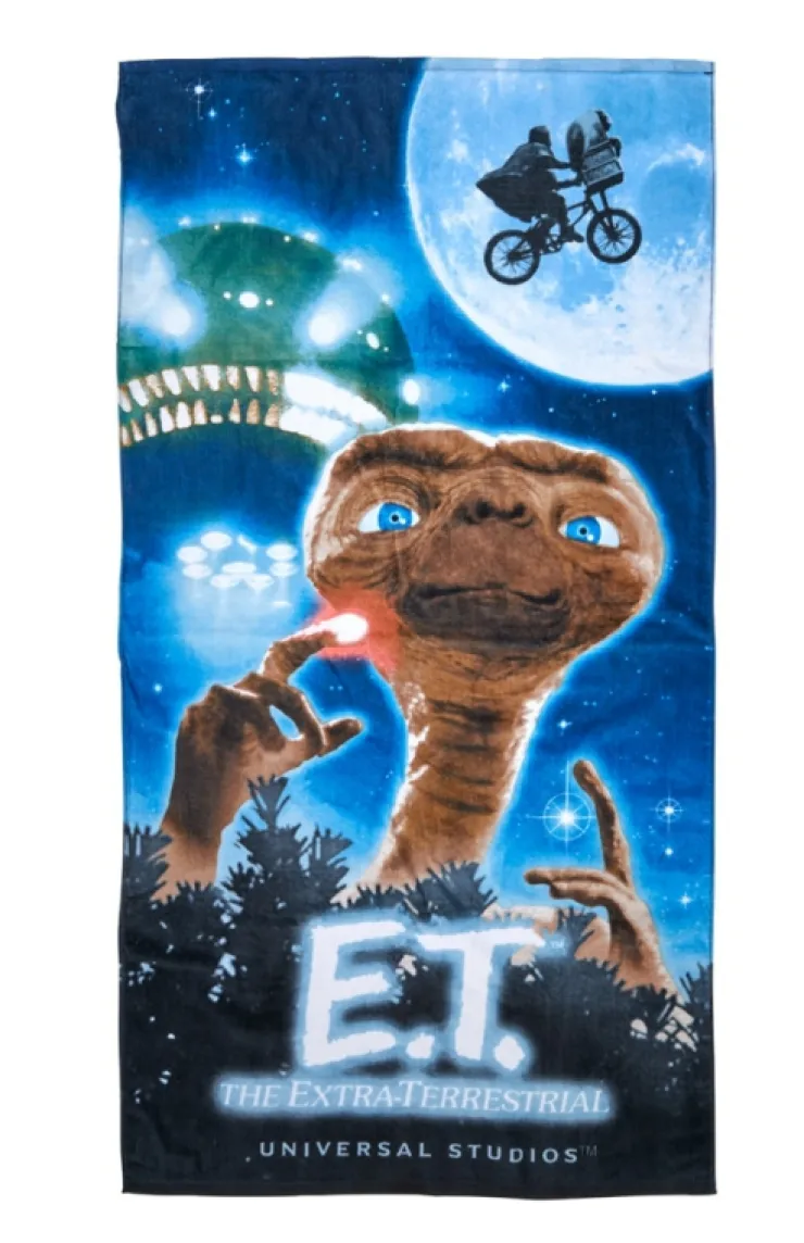 Commemorative beach towel featuring iconic imagery from E.T. The Extra-Terrestrial, printed on soft cotton fabric.