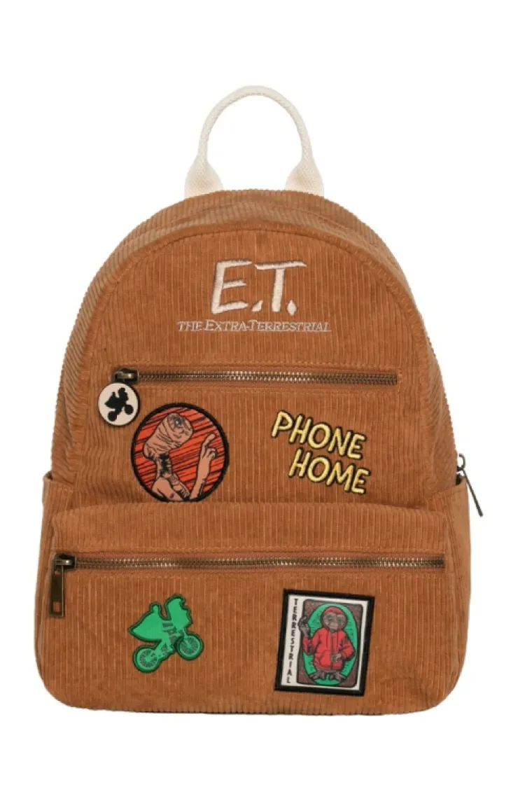 E.T. mini corduroy backpack in the color brown featuring patches paying homage to iconic moments from the film.