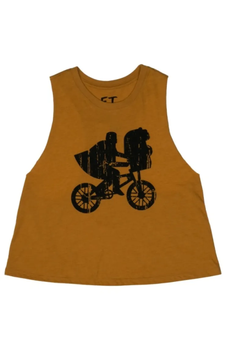 E.T. ladies tank in a dark yellow color featuring a silhouette of E.T. and Elliot from the iconic moment in the film.52%…