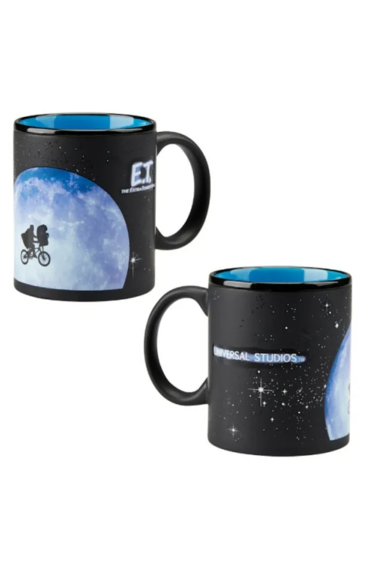 Commemorative mug featuring the iconic silhouette of Elliott and E.T. on a bike, riding past a vibrant full moon and starry sky with "Universal Studios" printed on the other side. Design is accented by a matte black finish and glossy, sky blue interior.