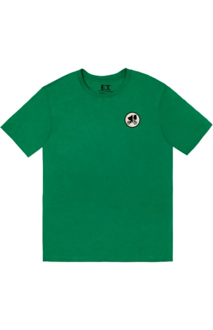 E.T. t-shirt in the color green featuring a silhouette of E.T. and Elliot in front of the moon on the front left side. Back side features E.T. Surrounded by "E.T. The Extra Terrestrial" on the top and bottom.