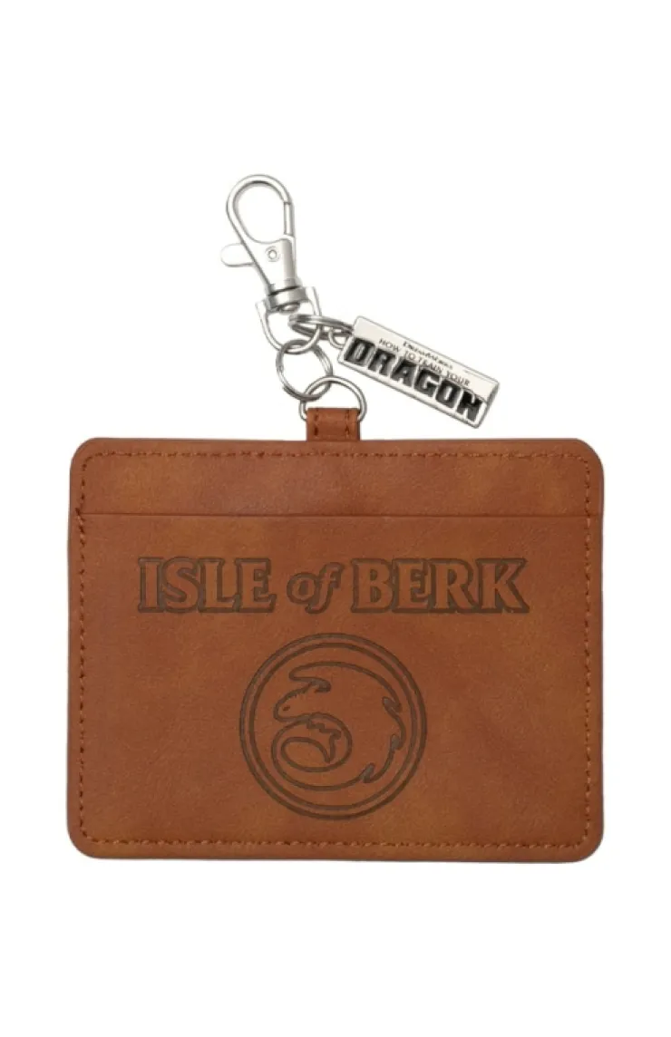 Epic Universe's Isle of Berk lanyard pouch featuring an embossed design of the Isle of Berk logo with a "How to Train Your Dragon" charm.