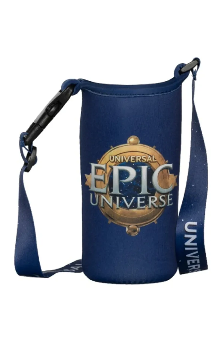 Epic Universe beverage holder in the color blue featuring the Epic Universe logo with adjustable strap.