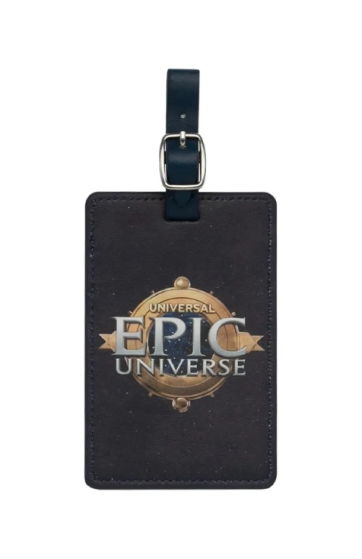 Epic Universe luggage tag featuring the Epic Universe logo on a beautiful deep blue starry background.