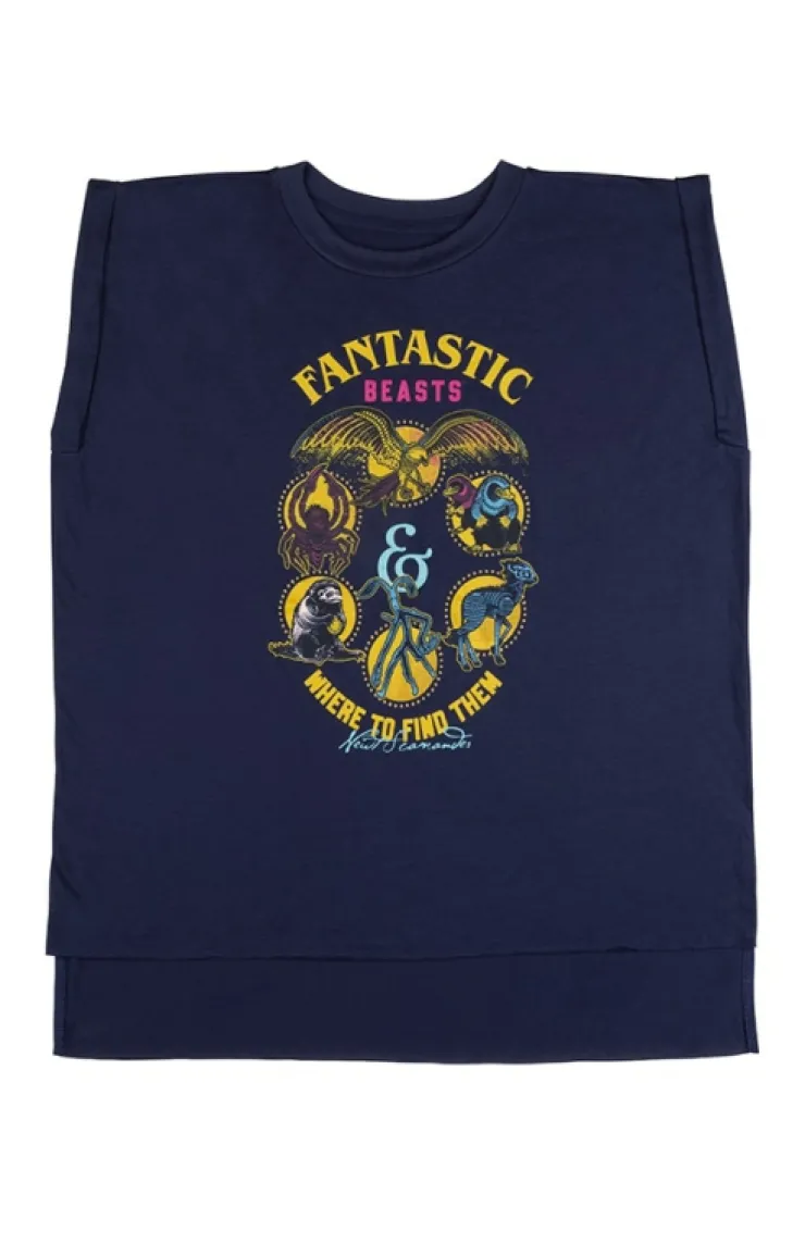 The Wizarding World of Harry Potter™ Fantastic Beasts & Where to Find Them sleeveless ladies t-shirt featuring iconic beasts screen printed against a soft lightweight material. The navy-blue shirt is accented by the gold designs, making each magical creature stand out.