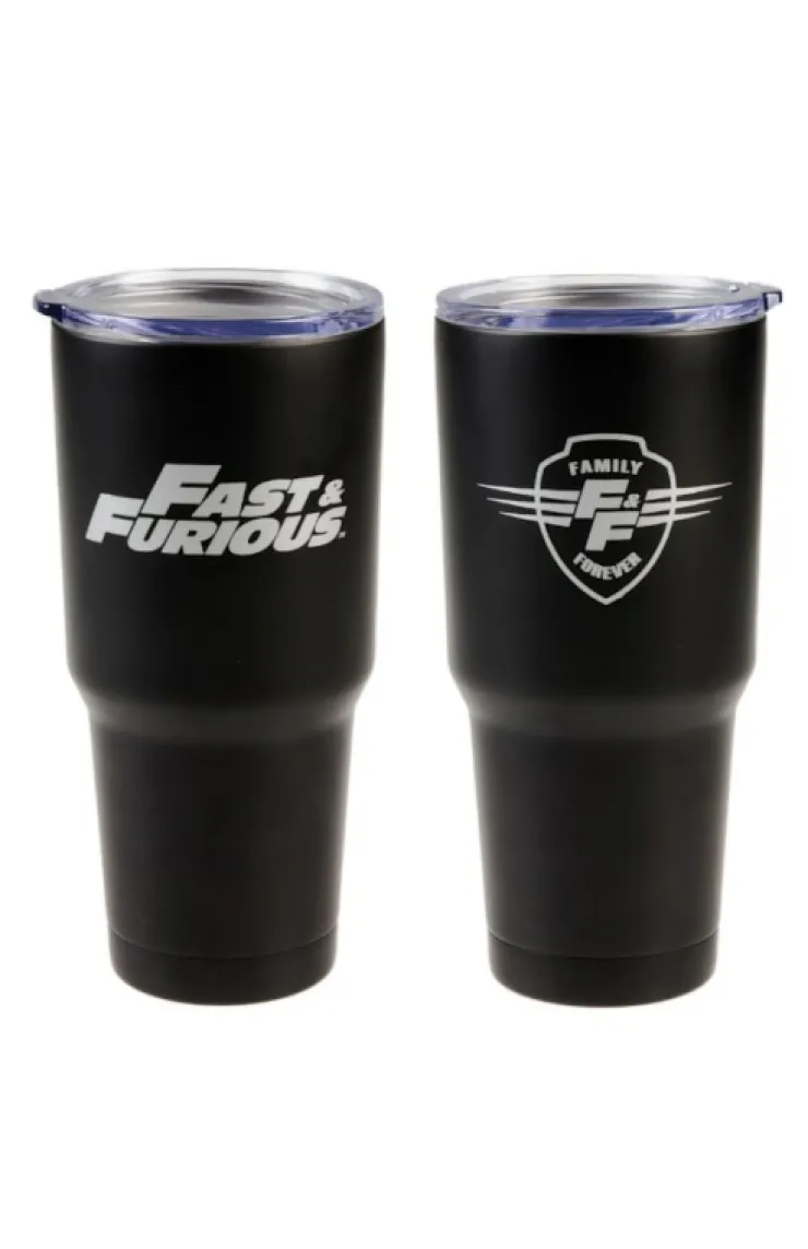Let your drink travel in style with this sleek, stainless steel tumbler featuring the Fast & Furious and Family Forever logo. Designed for both hot and cold beverages, this tumbler is copper lined, insulated, and fits most cup holders.
