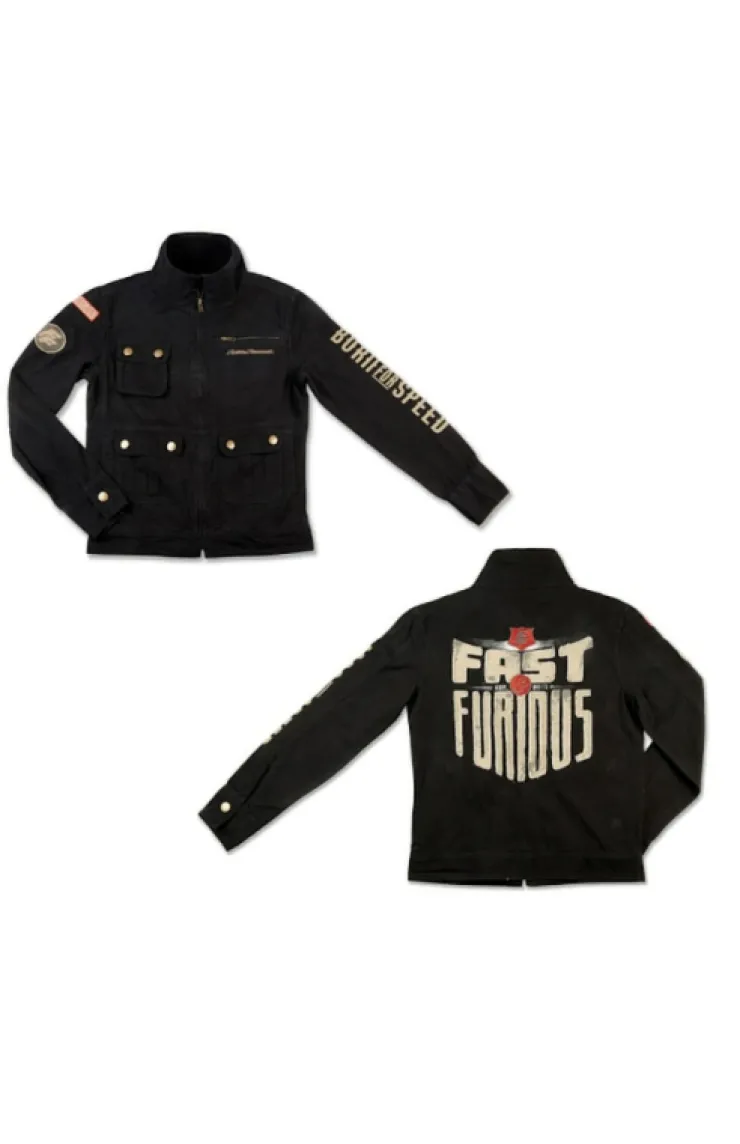 Keep warm in this trendy multi-pocket twill jacket with a zip-front closure, accented with burnished snaps on the 3 front pockets. Jacket features big, bold, appliqued Fast & Furious logo on the back. Left sleeve print states "Born for Speed" with patches and embroidery throughout the design.