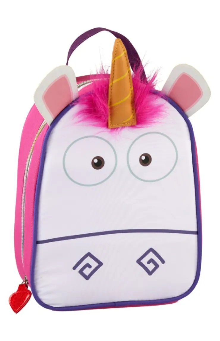 Super cute, Fluffy the Unicorn lunch bag featuring a primary rainbow zippered compartment with interior pocket, carrying handle, and insulated walls to keep your meals cold.