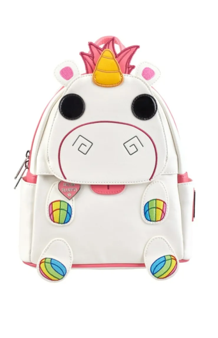 Adorable faux leather Funko Pop!® mini backpack by Loungefly featuring Minions Fluffy Unicorn. Design has embroidered detailing, pink & silver-tone accents, adjustable shoulder straps, zippered main compartment, zippered front compartment, pockets on each side, and a lined rainbow patterned interior.