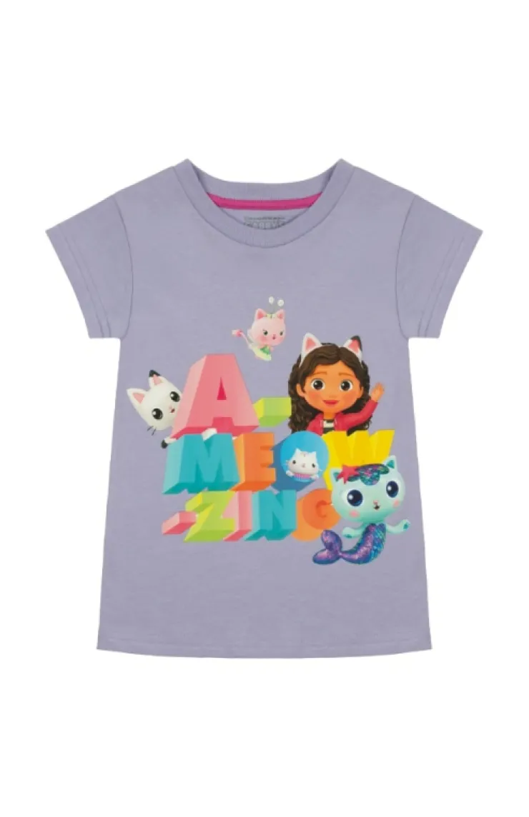 Gabby's Dollhouse youth t-shirt in the color lavender featuring some of your favorite characters with " A-MEOW-ZING" across the front.