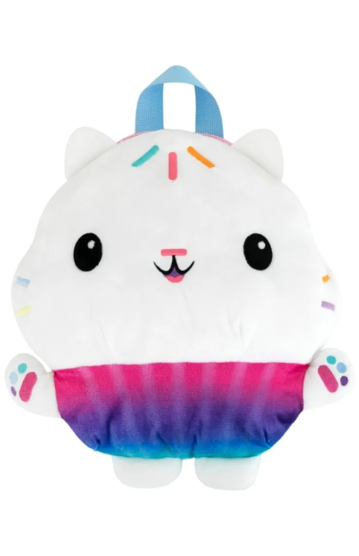 Gabby's Dollhouse plush backpack featuring an adorable Cakey Cat with zippered compartment and adjustable straps.