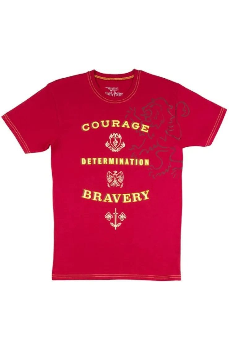 House t-shirt describing the attributes of a Gryffindor – Courage, Determination, and Bravery – screen printed on the front. Design also features the house icon and house colors.