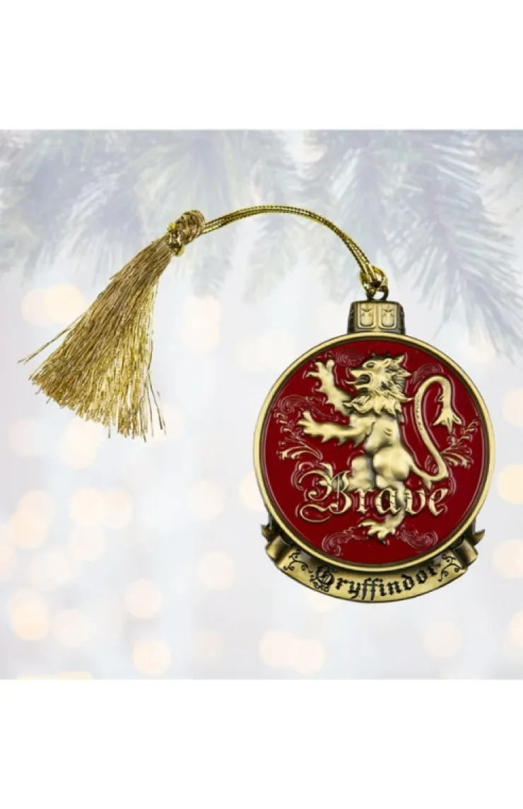 Ornament from The Wizarding World of Harry Potter™ that describes the attributes of a Gryffindor. Sculpted design is enamel filled on antique style gold-tone metal, complimented by a gold-colored tassel for hanging.