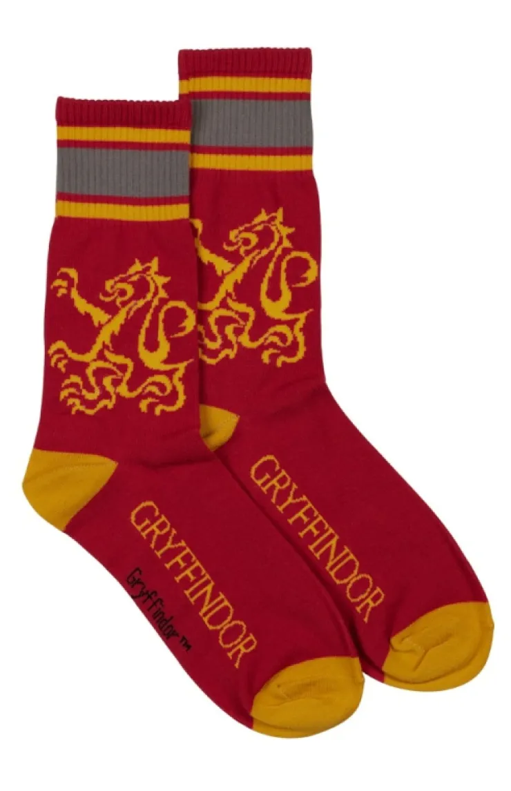 Represent your house pride in these comfy, Gryffindor crew socks featuring the house emblem and the daring scarlet and gold coloration.