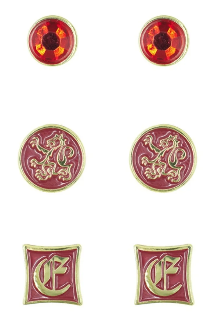 Trio of stud Gryffindor earrings with brass finish, photo etched detail and polished soft enamel.