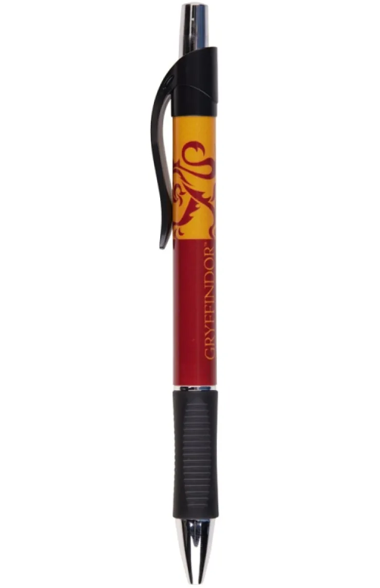Record your notes with this Gryffindor ballpoint pen featuring house colors, name, and lion emblem. Retractable click pen with a comfort grip writes in black ink and has a clip for securely storing it where you need to.