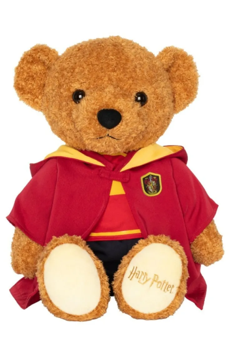 Adorable plush bear wearing a removable Gryffindor Quidditch robe with a stripped scarlet and gold sweater underneath.