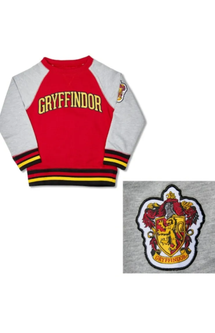 Gryffindor crew neck youth sweatshirt with house name appliquéd on color-blocked body, and woven house crest on left sleeve from The Wizarding World of Harry Potter™. Comfortable, tri-tone sweatshirt with raglan sleeves features house colors striped along ribbed cuffs and waistband for an additional fashion touch.