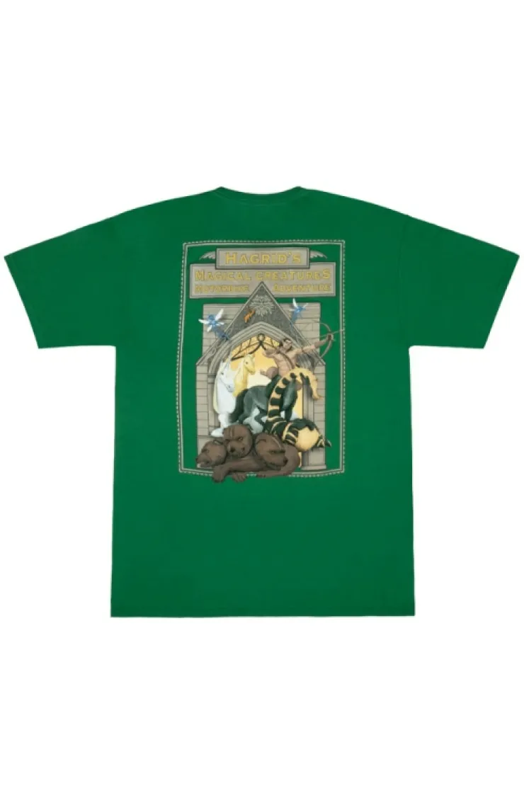 Green t-shirt featuring "Hagrid's Magical Creatures Motorbike Adventure™" on the front upper left side and on the back features beautiful artwork of various magical creatures with "Hagrid's Magical Creatures Motorbike Adventure™" across the top.